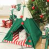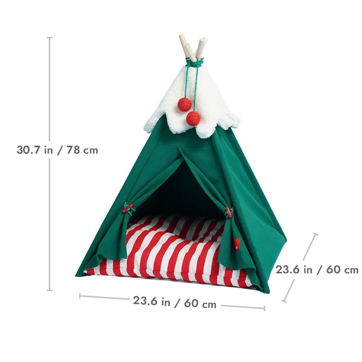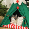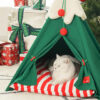 Snow drifted softly as Misty snuggled into her new Christmas cat teepee. The cozy red plush interior of the Christmas cat bed resembled a winter wonderland hideaway. Outside, evergreen trees were frosted with white powder, complementing the teepee’s woodsy natural structure.