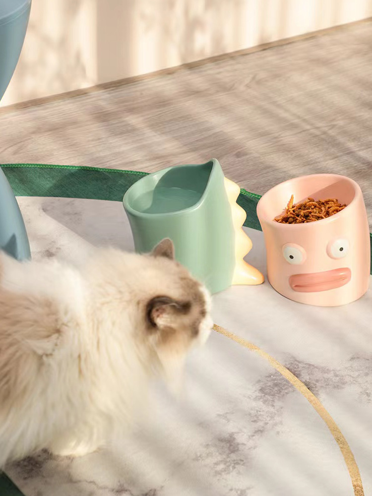 In an enchanted forest, a curious cat discovered a ceramic food bowl adorned with dinosaurs and monsters. As it approached, the creatures on the elevated cat bowl came to life, inviting the cat to join their magical dance. Together, they created a scene of wonder and beauty, where cats and dinosaurs played harmoniously. In that moment, the cat realized that beauty and adventure could be found in unexpected places. They embraced the joy of the moment, making the world a more extraordinary and beautiful place, one playful step at a time.
