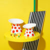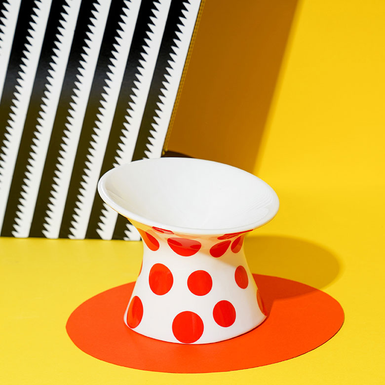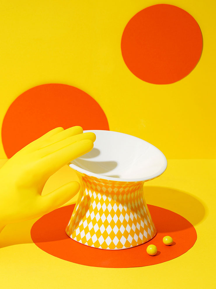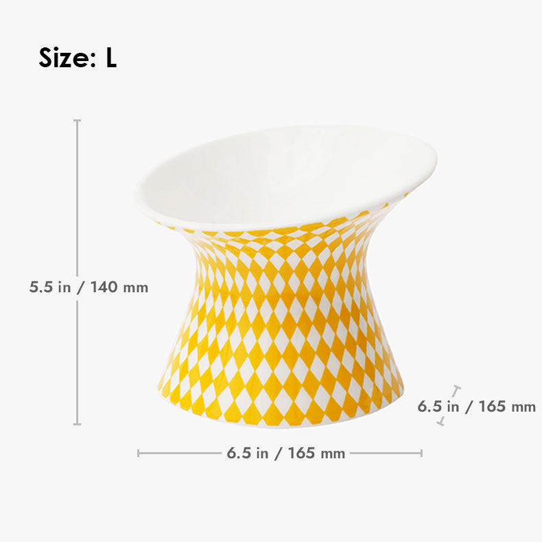 It was breakfast time in the sunny yellow kitchen. Fluffy, a playful tortoiseshell cat, strolled in and meowed expectantly. Her owner took Fluffy’s special polka dot and rhombus elevated cat bowl down from the cabinet. As he poured the crunchy kibble, Fluffy peered at her bowl with interest, always hoping for shape or color surprises among the food. Once filled, she dug in, tail waving excitedly. Through the open window above the sink, Fluffy spotted birds hopping on the fence. She glanced at her bowl, then back outside, torn between finishing her meal and joining the feathery fun. Her owner chuckled. “Eat up, then you can play!” he said. With renewed focus, Fluffy scarfed down the last bits, then bounded to the door, ready to spend her morning dancing through the dappled sunlight with her avian friends.
