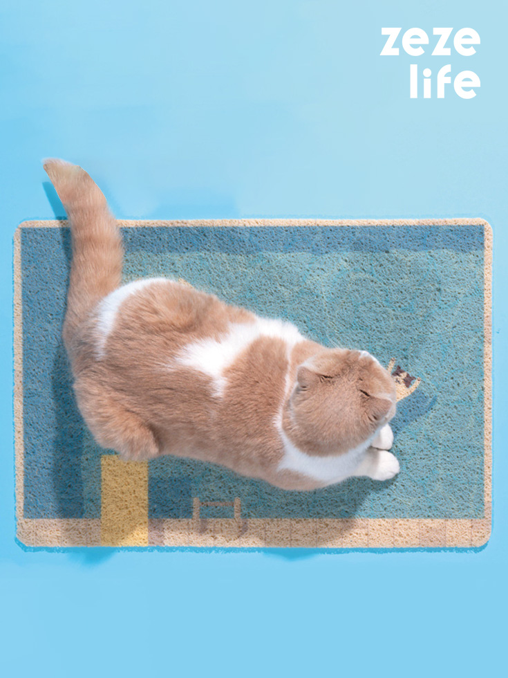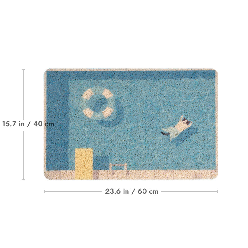 Kittens slid across the swimming pool cat litter mat, the colorful beach ball and flip flop designs reminding her of family vacations. She meowed happily, glad her owner got this mat to contain the litter she flung from her box on hot summer days.