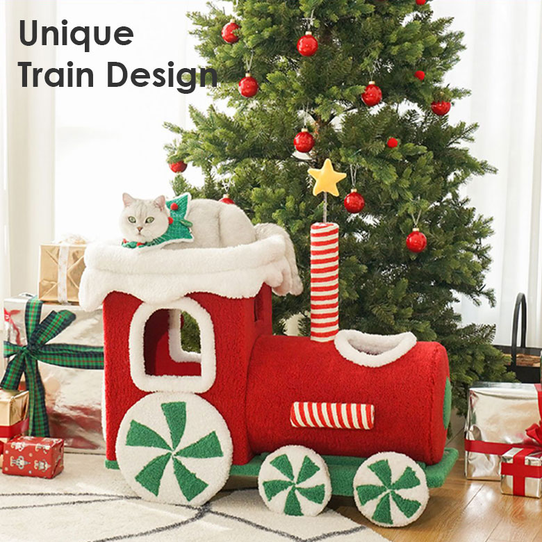 - Festive Design – This cat condo is shaped like a train and features a cute and colorful Christmas-themed design that adds a touch of holiday cheer to any home decor.
