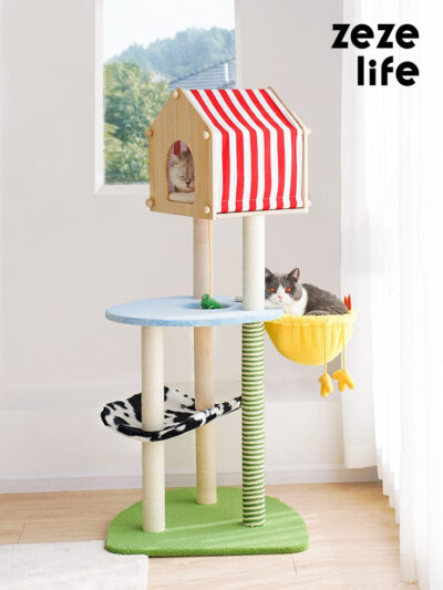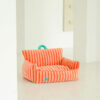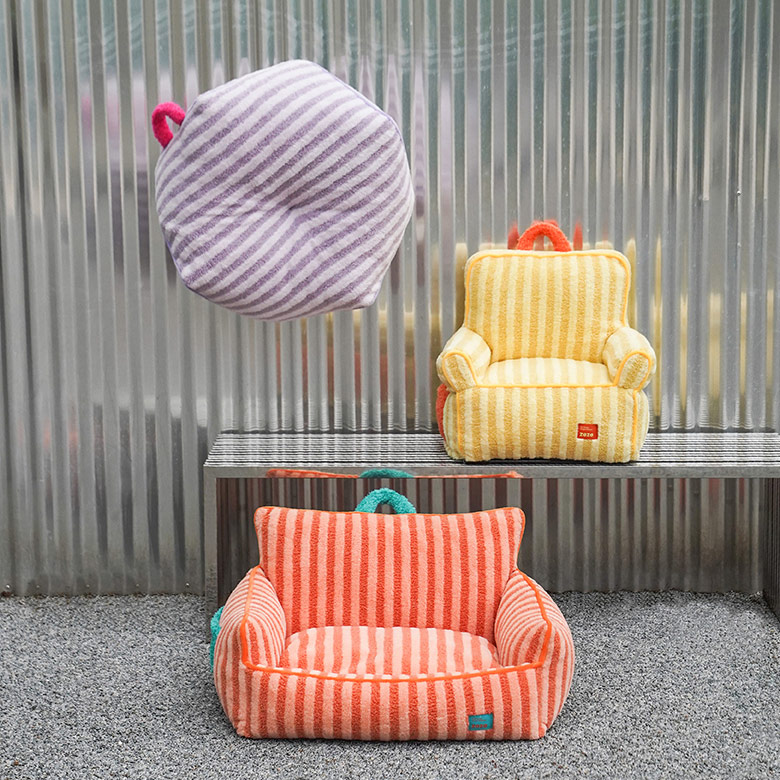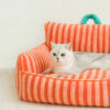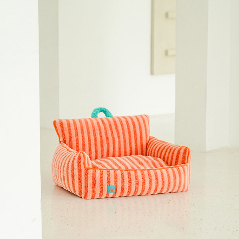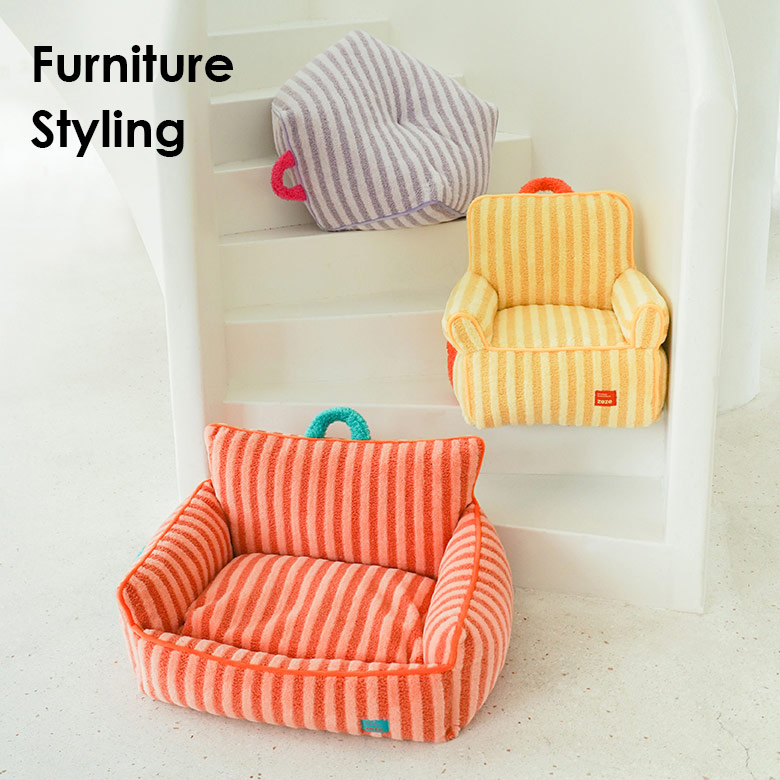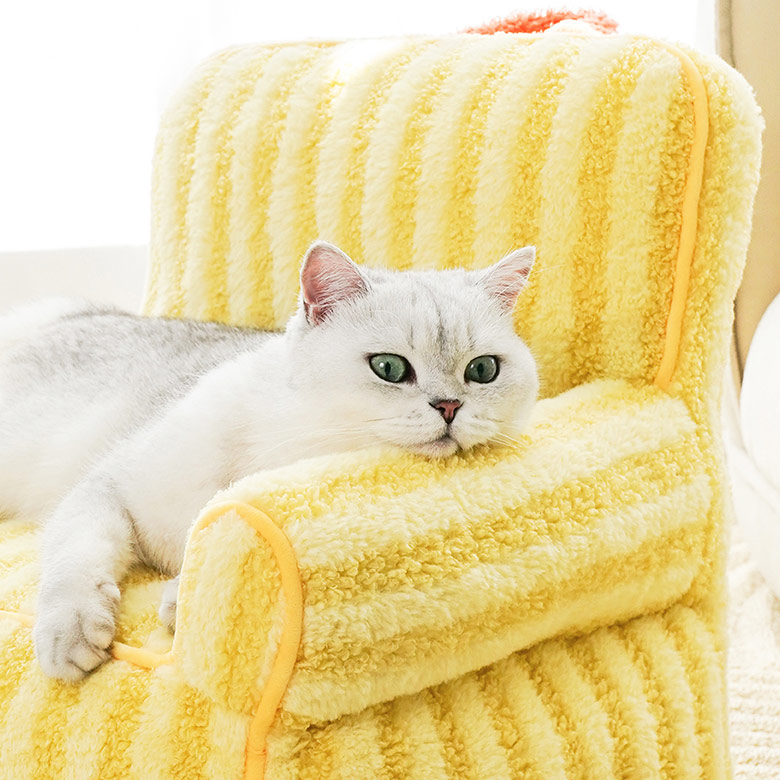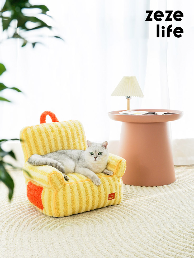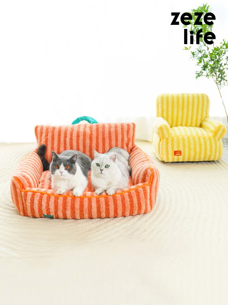 The colorful striped cat sofa is versatile for various home styles. The owner sits on the big sofa, and the pets lie on the small sofa to enjoy the happy time together.