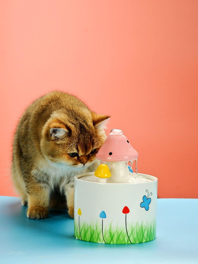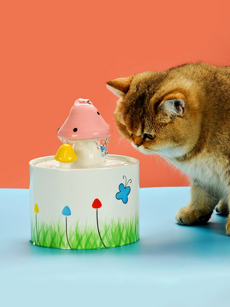 This pink mushroom cat water fountain provides a source of clean running water and encourages pets to drink—which can play an important role in long-term health, especially for you loving cats!