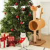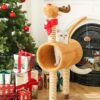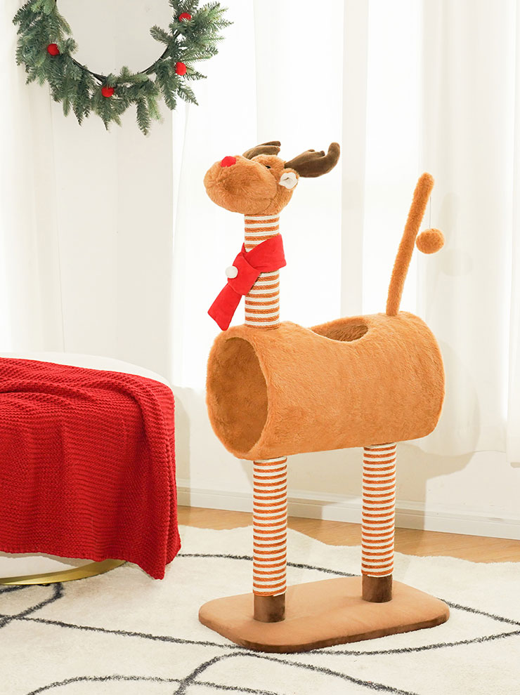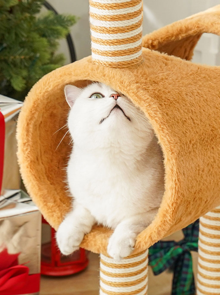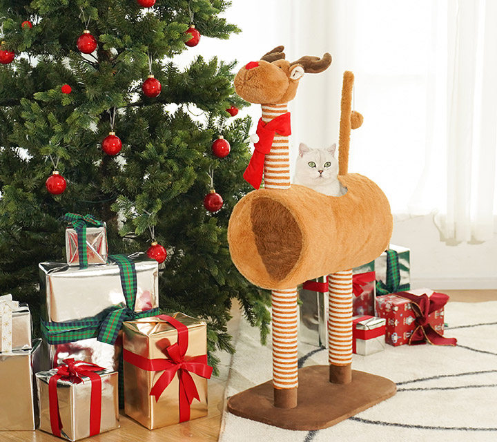 It was Christmas Eve and snow blanketed the ground outside as little Mitten explored her new Christmas elk cat tree. She swatted at the dancing catnip toy dangling from its tail and scampered up the posts, her claws scratching the cozy sisal rope. Reaching the top, Mitten peeked out of the tunnel at her humans decorating their tree. She then curled up in the soft, fluffy elk head and began to purr. From the living room, her family smiled at the sweet sight unfolding before the warm fire. When Mitten’s sister joined her up high, they took turns chasing each other and ambushing the toy together. Down below, the humans watched their kittens romp through the antlers with glee, bringing Christmas cheer to the tiny feline adventures unfolding in their home each day. For Mitten, her new Christmas elk cat tree was the perfect gift.
