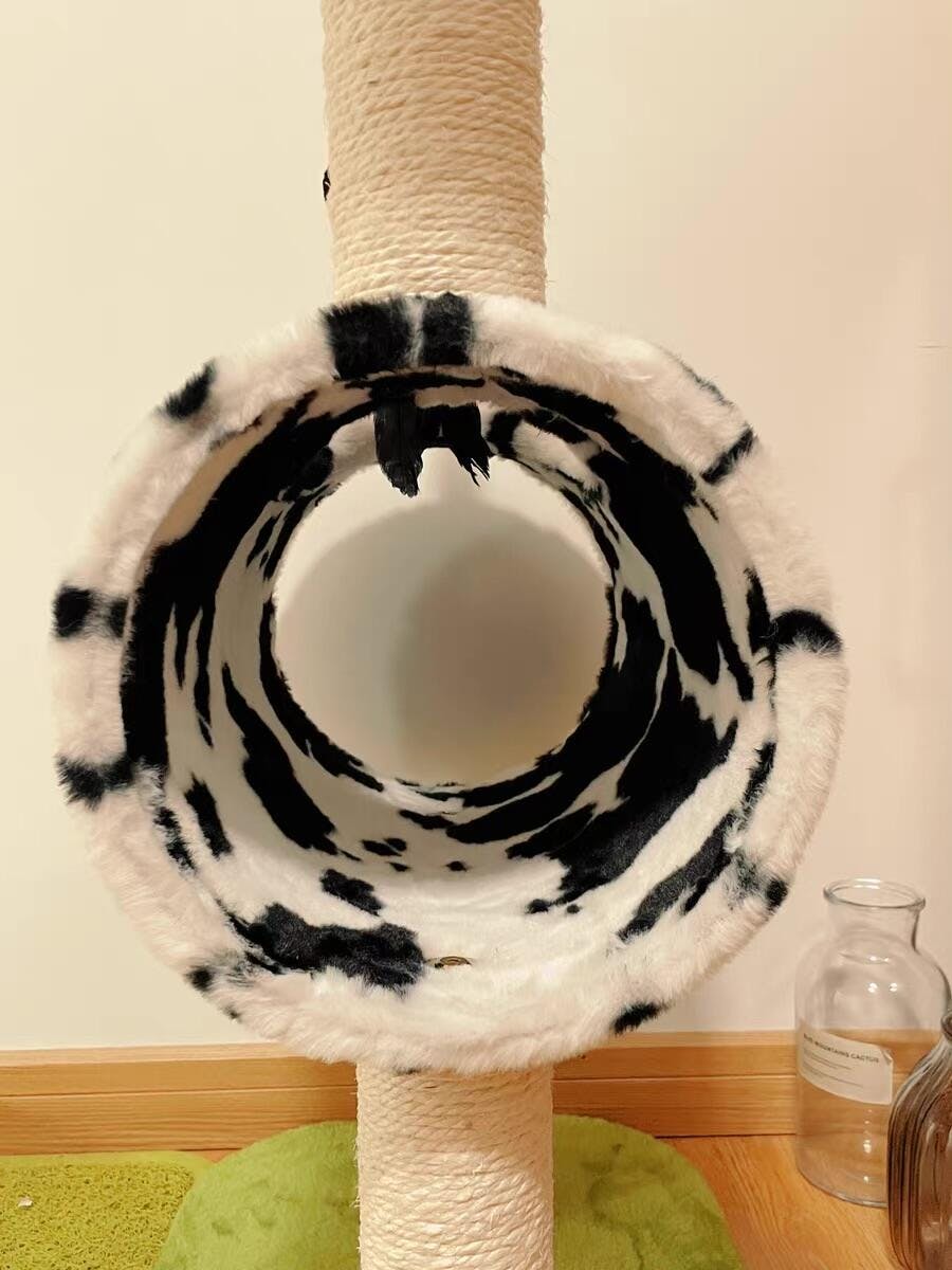 - Cat Tunnel Body – The cow cat tree with tunnel has a tunnel-shaped body that allows cats to climb through, stick their head out of multiple openings, and nest inside. This enclosed space gives cats a sense of coziness and security.