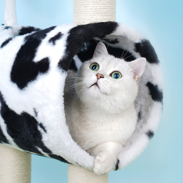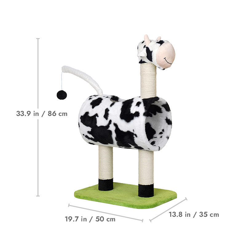 - Scratching Posts – The two legs of the cow cat tree with tunnel are covered in sisal rope , allowing cats to scratch and stretch. The tall, vertical posts also give cats opportunities for climbing and perching.